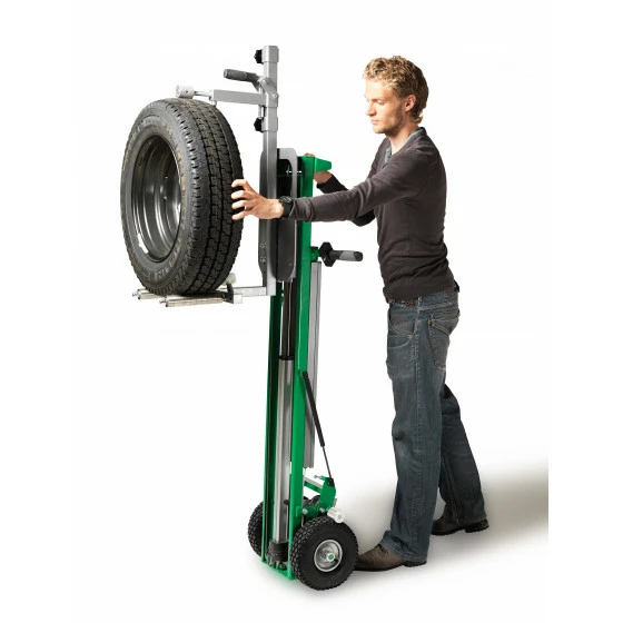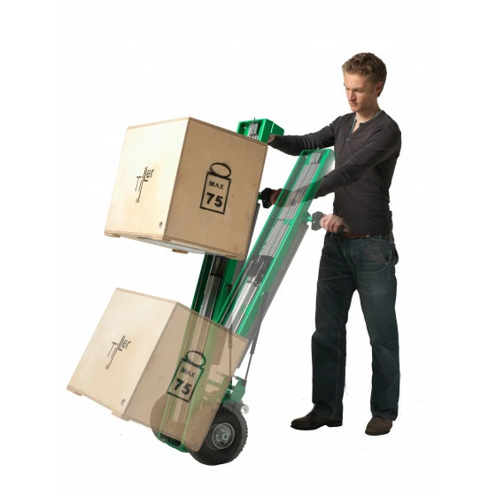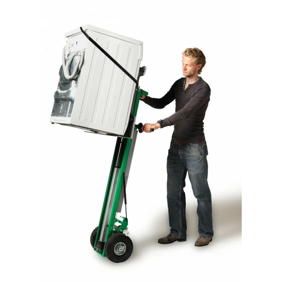 Pour plus de sécurité et d’aisance, le déplacement est assisté par un moteur quand l’élévateur est en position gerbeur. Léger et compact ce qui facilite sa maniabilité, permet un gain de place et une utilisation avec un véhicule utilitaire. Prise en main facile et confortable grâce aux 2 poignées caoutchoutées et ergonomiques. Une poignée haute permet d’adapter la position des mains pour une manipulation plus confortable lorsque l’élévateur est incliné. Equipé de roues pneumatiques Ø 280 mm à crampons garantissant une manutention adaptée sur tout type de terrain. En position gerbeur, les roues sont automatiquement bloquées par des galets, ils entrainent les roues selon les manipulations de l’opérateur ce qui garanti une meilleur sécurité et un meilleur confort d’utilisation.